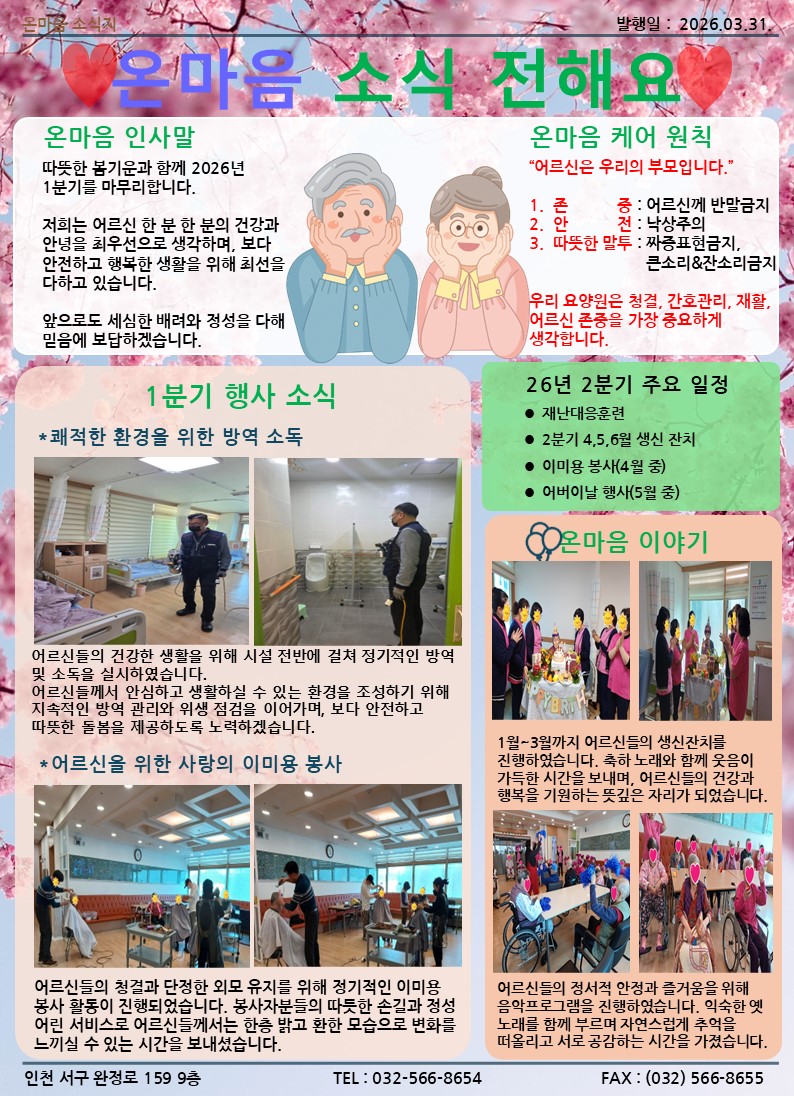 ![]() 2026년 1분기 동안의 어르신 생활 모습과 다양한 프로그램 활동을 담은 소식지를 전해드립니다. 항상 보내주신 관심과 신뢰에 깊이 감사드리며, 앞으로도 더욱 세심하고 따뜻한 돌봄으로 보답하겠습니다. |